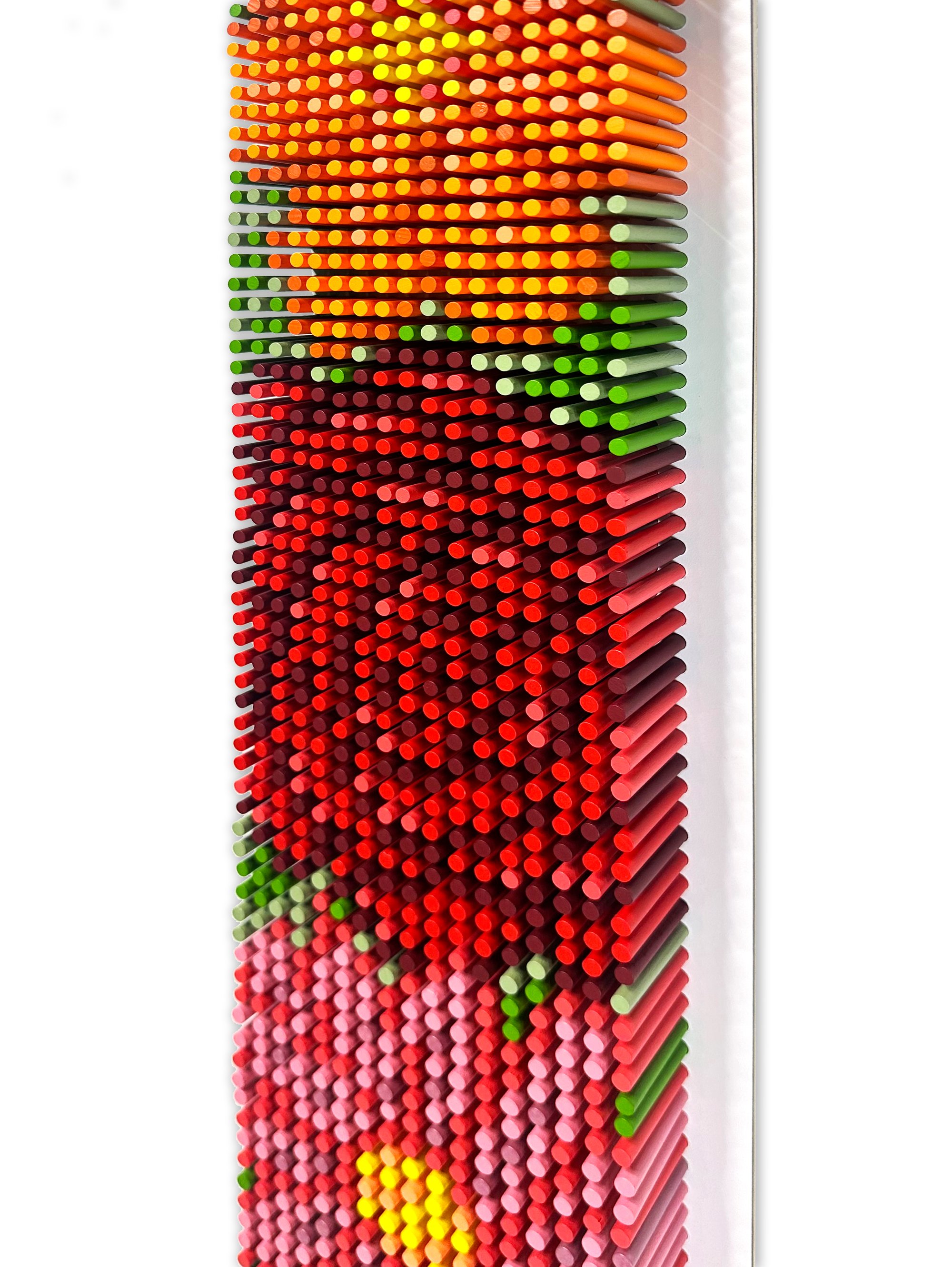 My creative journey is guided by a deep appreciation for order, precision, and the beauty of minimalism. Each of my pieces is meticulously crafted from thousands of painted wooden dowels, inserted into digitally designed boards with machine-drilled precision. This fusion of digital technology and handcrafted artistry ensures both structural complexity and expressive depth.