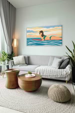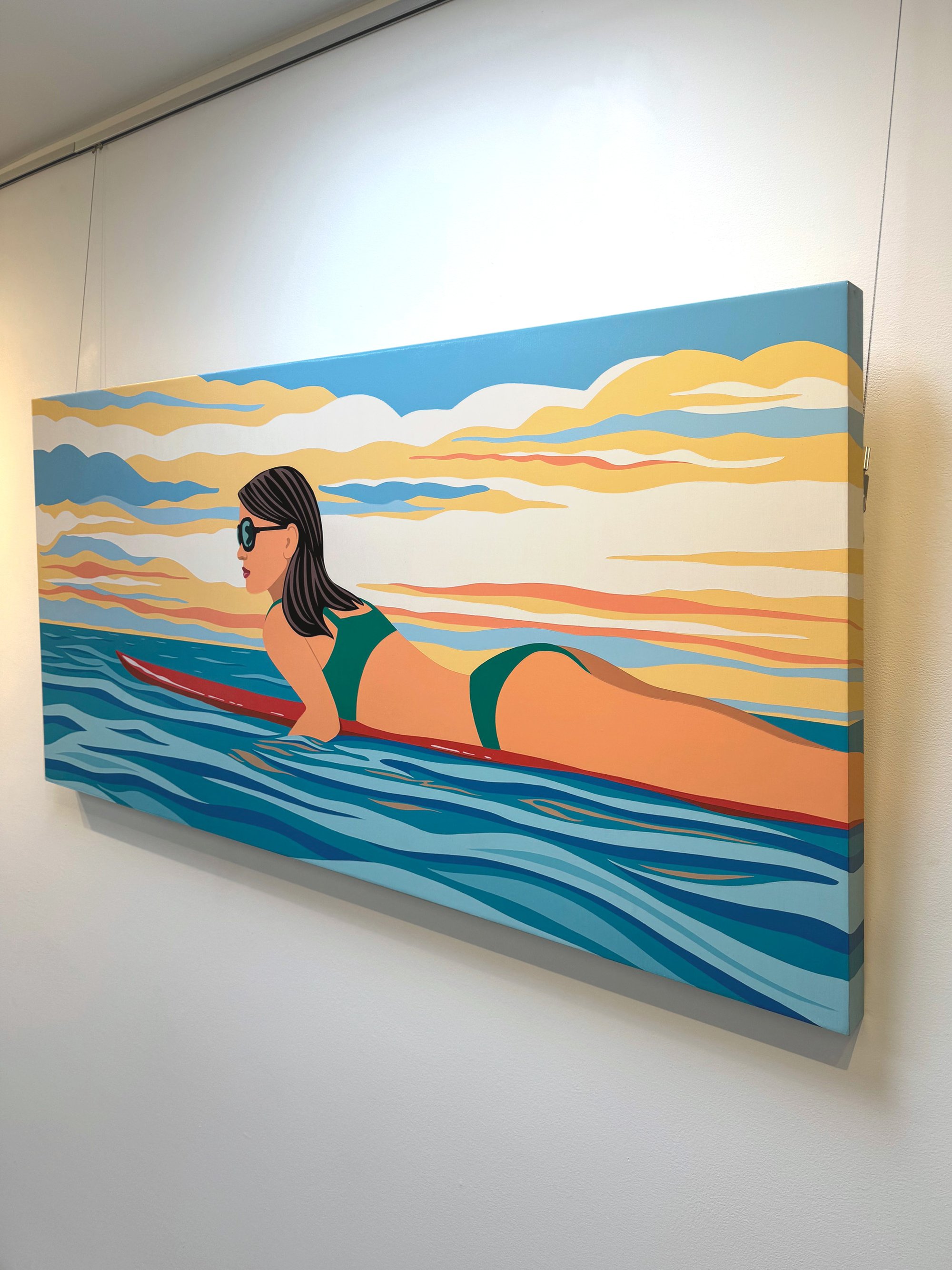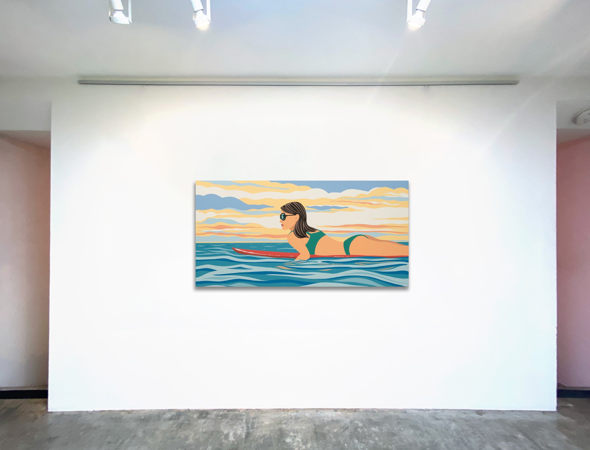 Wolanin’s background as a designer is evident in his dynamic compositions, fizzing color combinations, and bold use of graphic text. He forms each painting through an innovative stenciling technique that builds layer upon layer, color upon color. Beneath their glossy, seductive surfaces, the paintings swirl with intriguing psychological substance: Wolanin does not simply paint a scene, but constructs a fragment of narrative. Like the best portraitists, he can suggest entire relationships and personalities through a character’s pose or glance.