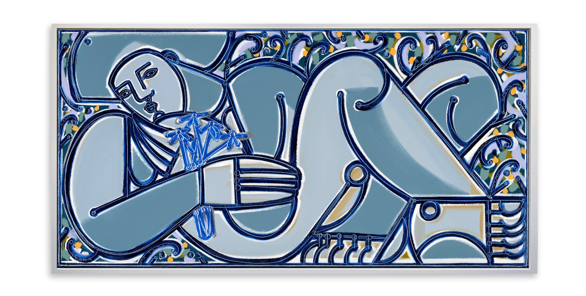 Focused on the human figure and the tales that emerge through the framework of shape, contour, and formal approach, Martin choreographs her forms in relentless flux. Her technique of freehandedly capturing her subjects yields unapologetic marks and a spirited palette that hums with the vitality and vigor of the world she creates. In addition to the figure, many of Martin’s works are populated with anthropomorphic elements such as birds, butterflies and flowers. For Martin, these elements provide both a contextual source of information, as well as symbolic significance, progressing the storyline as a representation of personality, mood, and character.