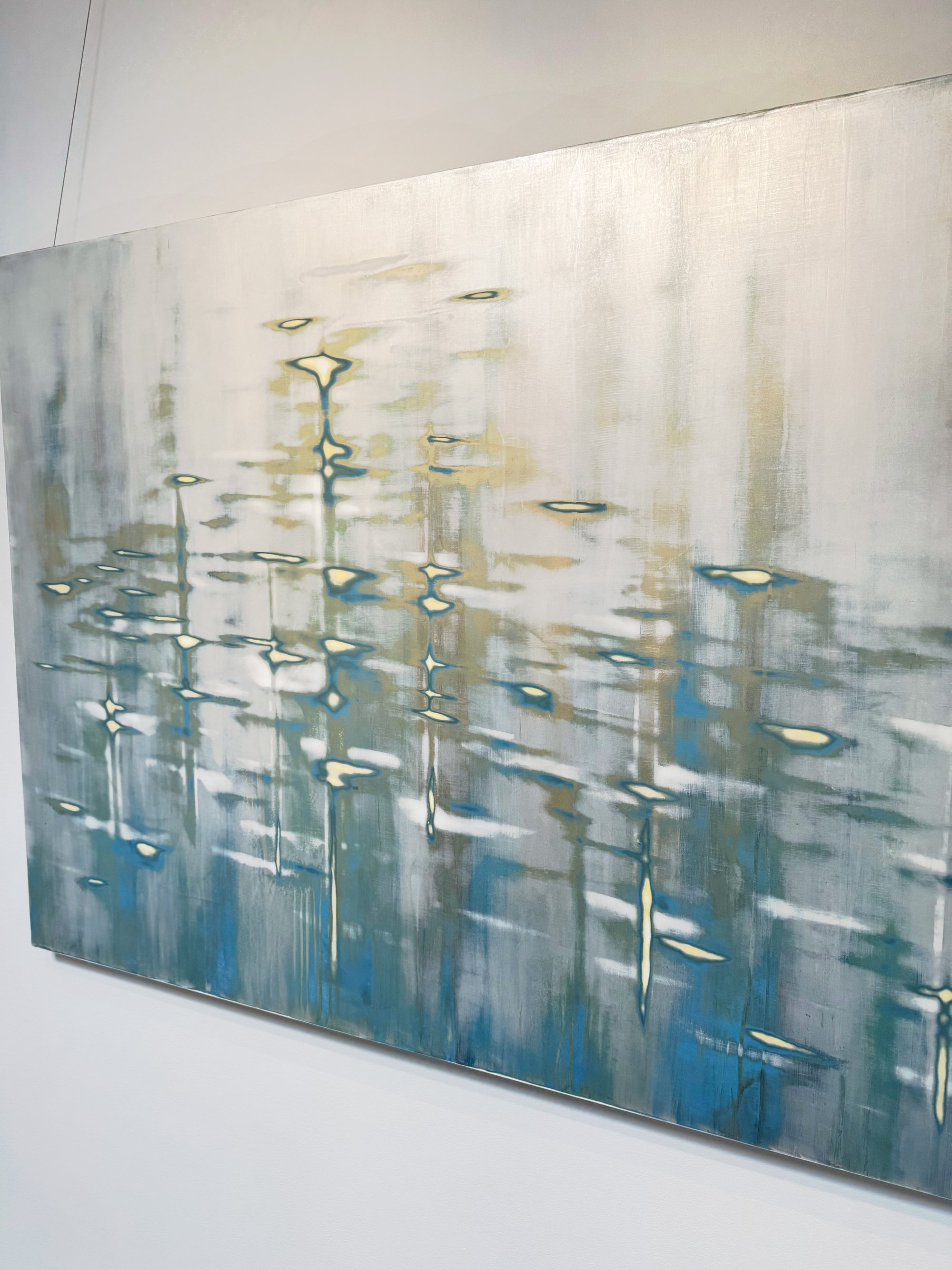 “For the majority of paintings in this exhibition I’ve chosen canvas over wood panels, which allows for more accidental movement from the flow of paint. I’m also emphasizing built-up layers of iridescent color that contrast with the matte colors underneath. Then, through a physically intense sanding process, the composition emerges with an almost sculptural depth—presenting the illusion of a living landscape,” Weaser explains.