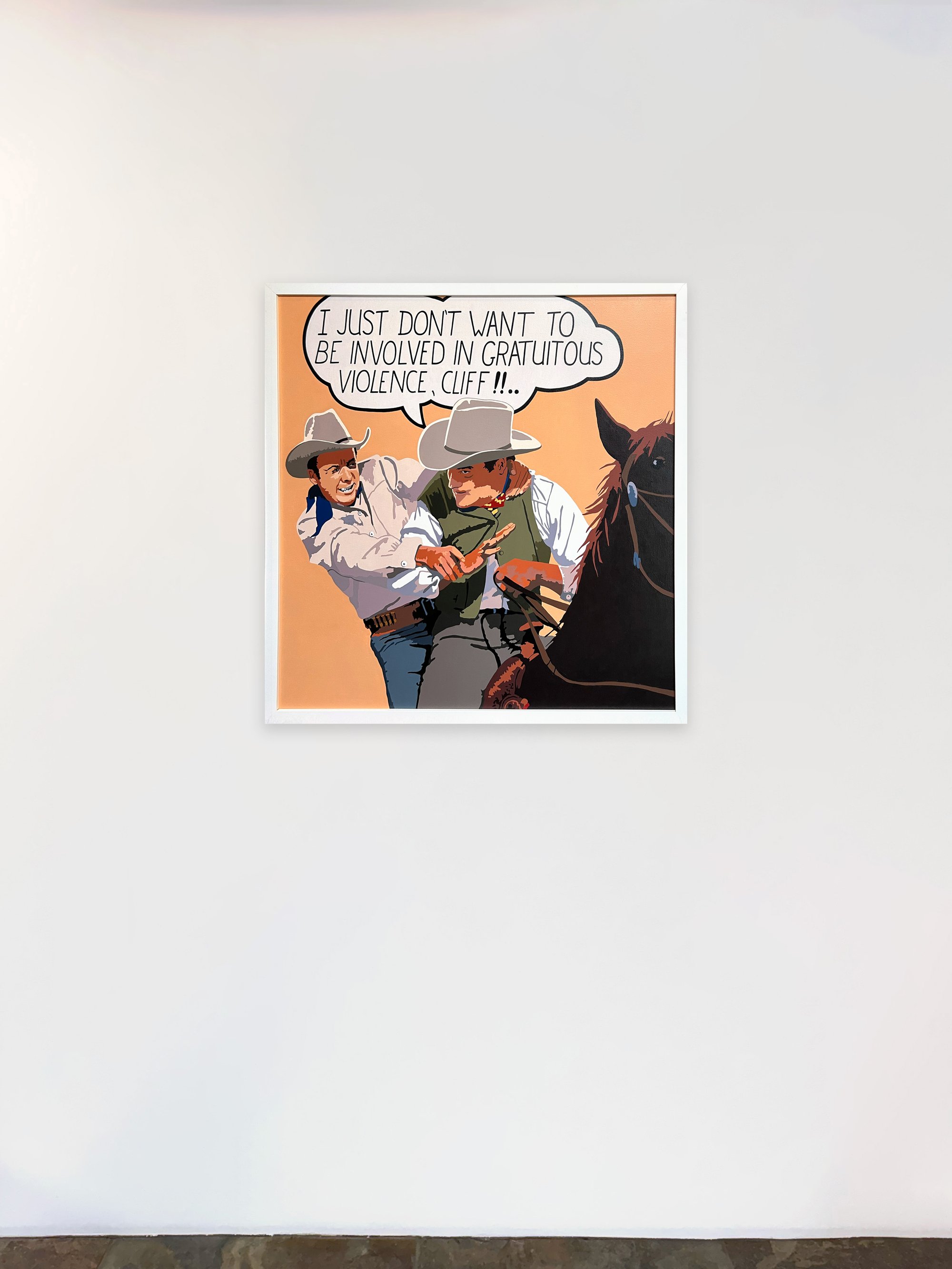 "47 years ago I left the Kansas City Art Institute with a B.F.A. in Painting. One week later I was in New York City to begin the launch of my career as an artist. I had no clue as to what that meant specifically - It was, however, the right move. I began making paintings based on black and white movie stills of Hollywood Westerns. The single most influential artist of that era (for me) was the Italian filmmaker Sergio Leone, who literally altered the course of film making with his trilogy of Spaghetti Westerns. I wanted to do with paintings in the Western genre what Leone had done with film. The beauty of working within the Western genre is that it has all the qualities of mythology, and metaphor. It has such a huge international mystique and has attained a timeless quality to it - no other genre in the last 200 years can compete." - Billy Schenck