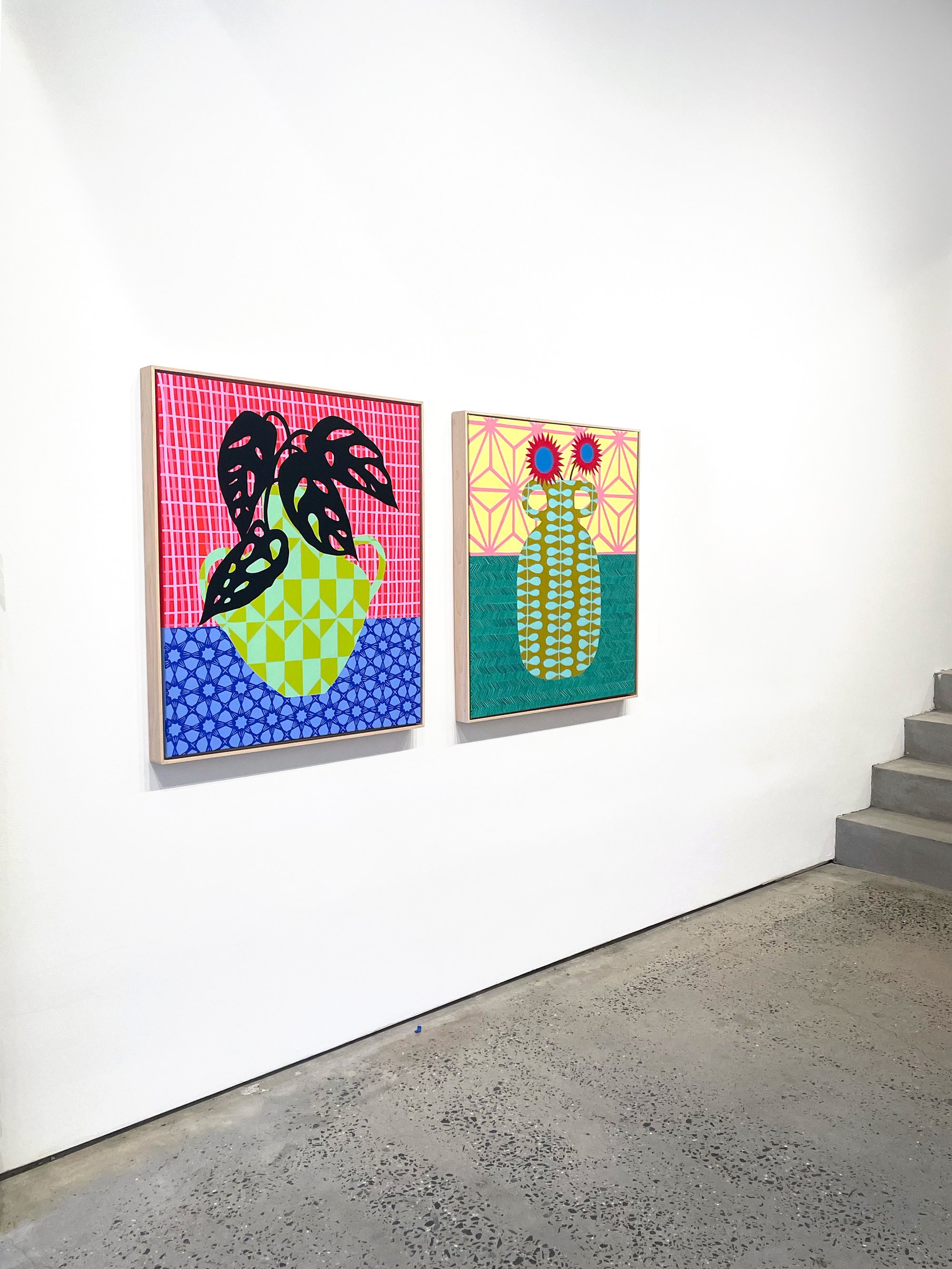 Mary Finlayson’s paintings are a celebration of color, pattern and form which navigate themes of home, memory, and self. Flattening the perspective of each scene, her works provide an intimate glimpse into each curated space. Her interiors pay homage to the iconic works of David Hockney, Henri Matisse, and Stuart Davis by borrowing similar bright color palettes, repetitive patterns and forms simplified, yet still creating complex, tightly constructed compositions unique to her own style.