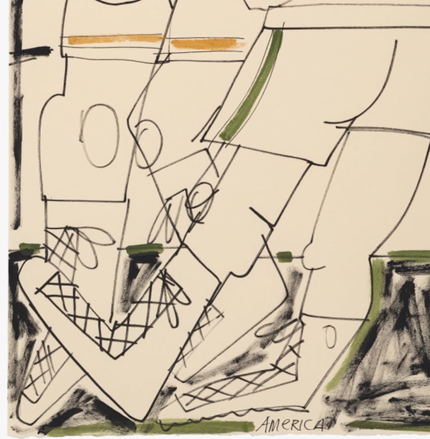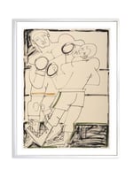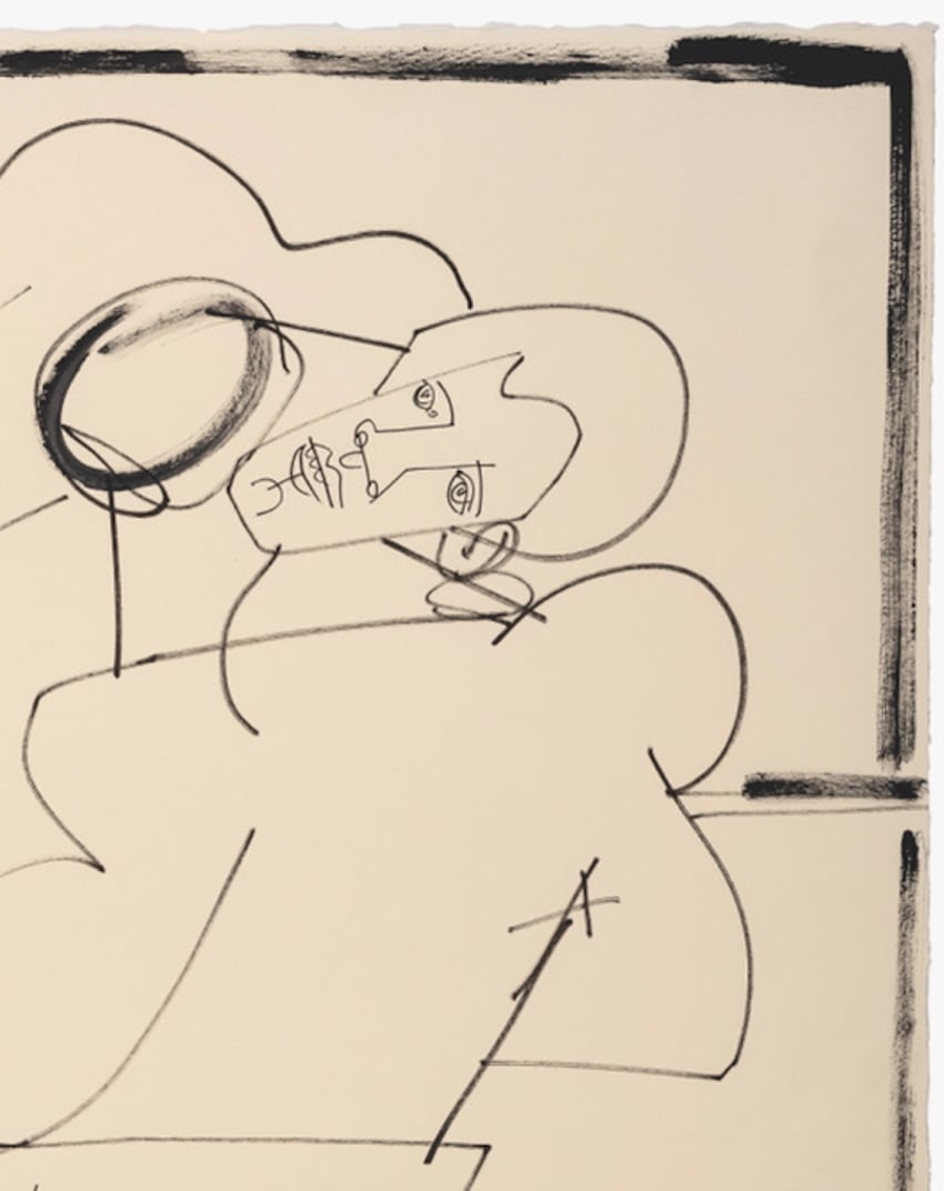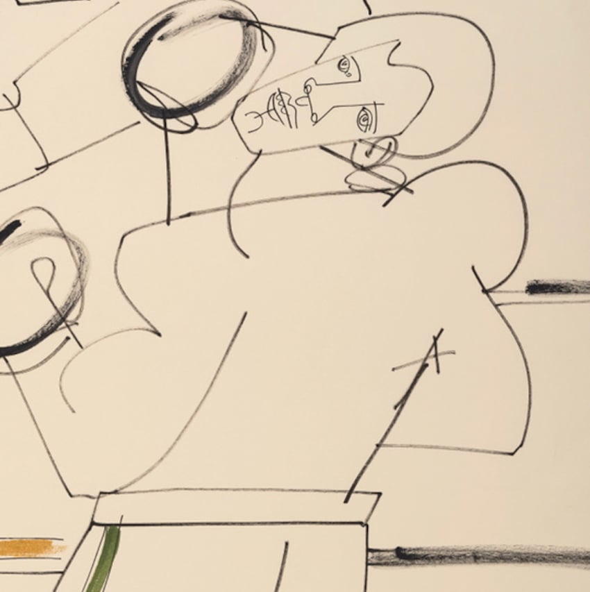 Experimenting with line weight and function as a tool for two dimensional representation of three dimensional forms, Martin takes on a new balance between solidity, weight and suggestion. Laden with nuance, the thick lines are filled with the bubbling energy of thin, long scrapes throughout their length - adding both intensity and dimension.
