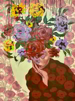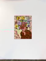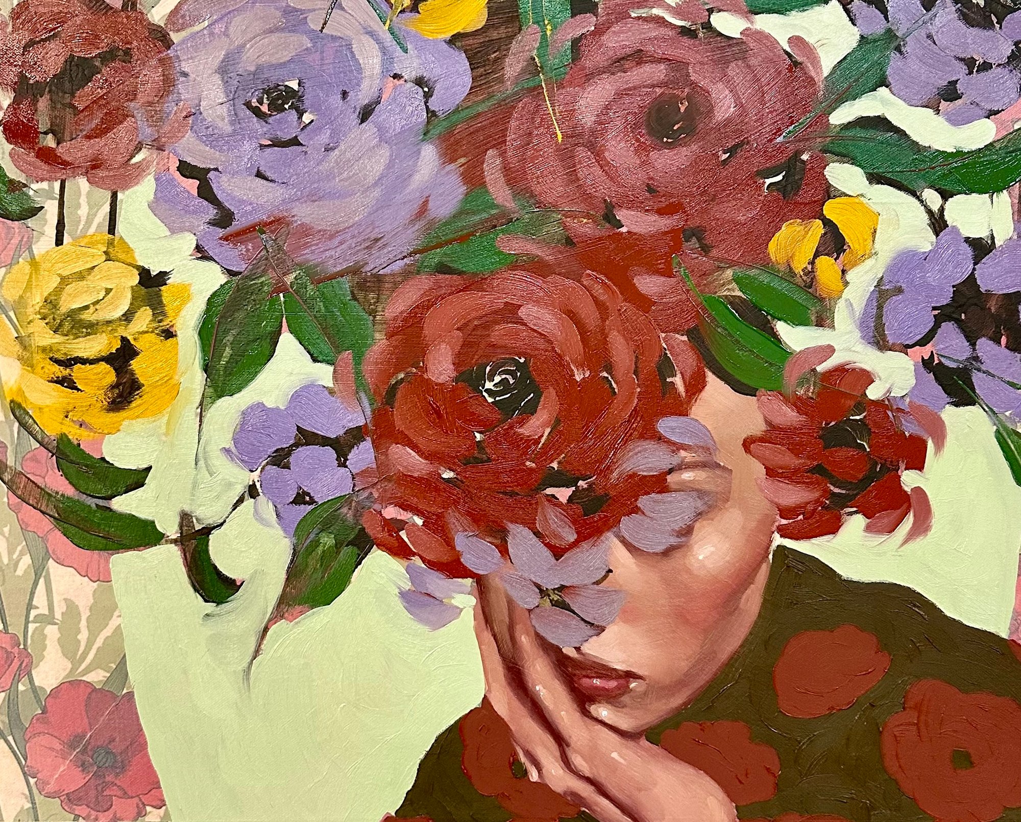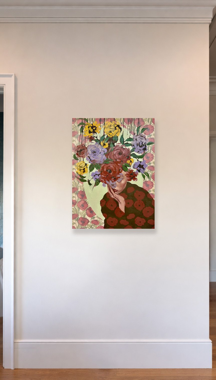 My strongest inspirations are fashion and design, so I dove into the idea of creating portraits of stylized women disguised by avant-garde, floral-inspired hats. Body language becomes very important in my work because I don’t rely on facial expressions to convey emotion like most figurative artists do. Instead, I rely on gesture, clothing, and color. The new pieces allow me to convey texture, design, and abstraction with a freedom I have never known until now. I have fallen in love with the expression, mystery, and disguise the pieces create. Costume has the ability to be empowering and beautiful, allowing us to become someone new. The nature of fashion is all about change and experimentation and I am thrilled to see where this will take me,”- Anna Kincaide.