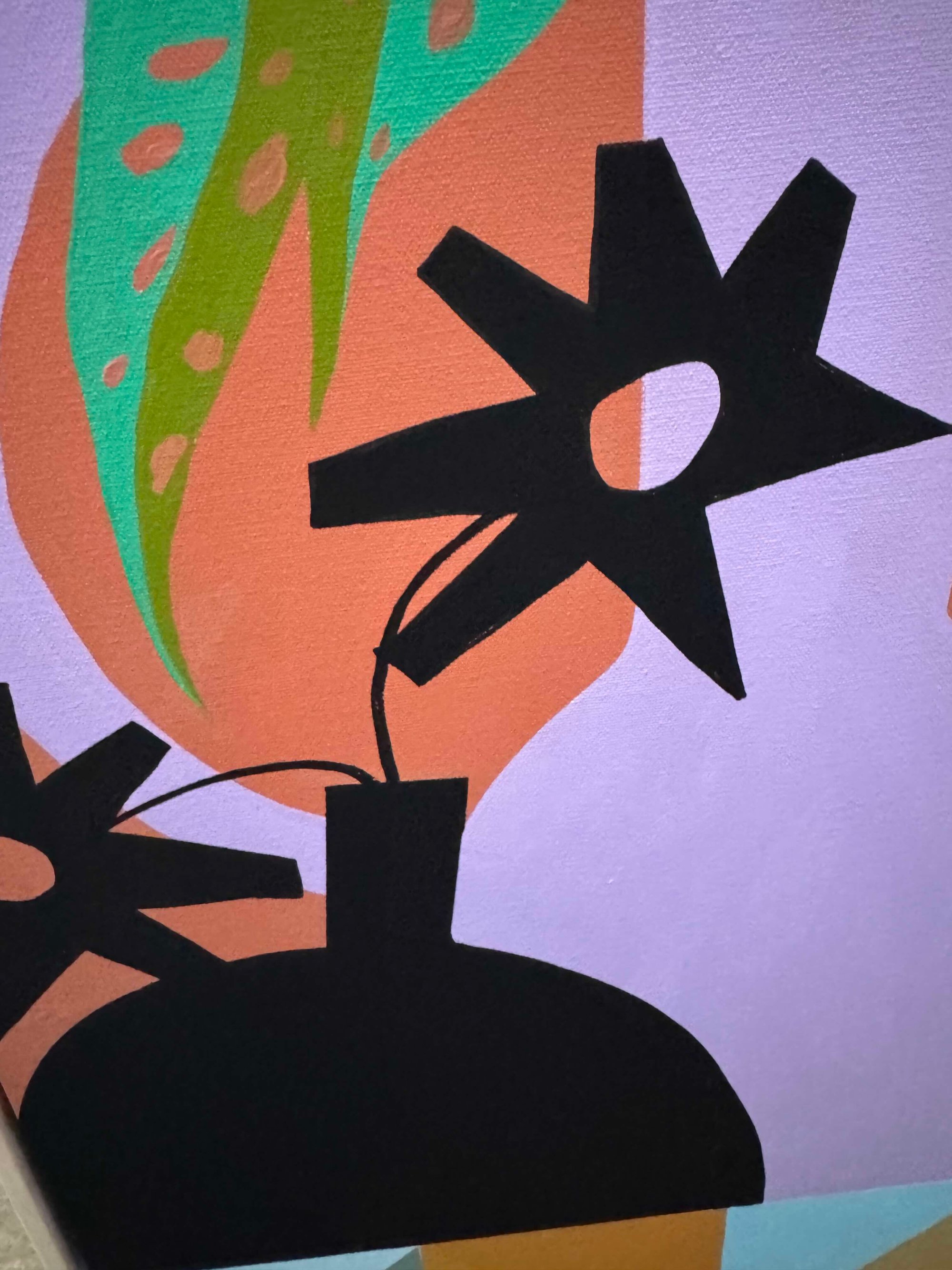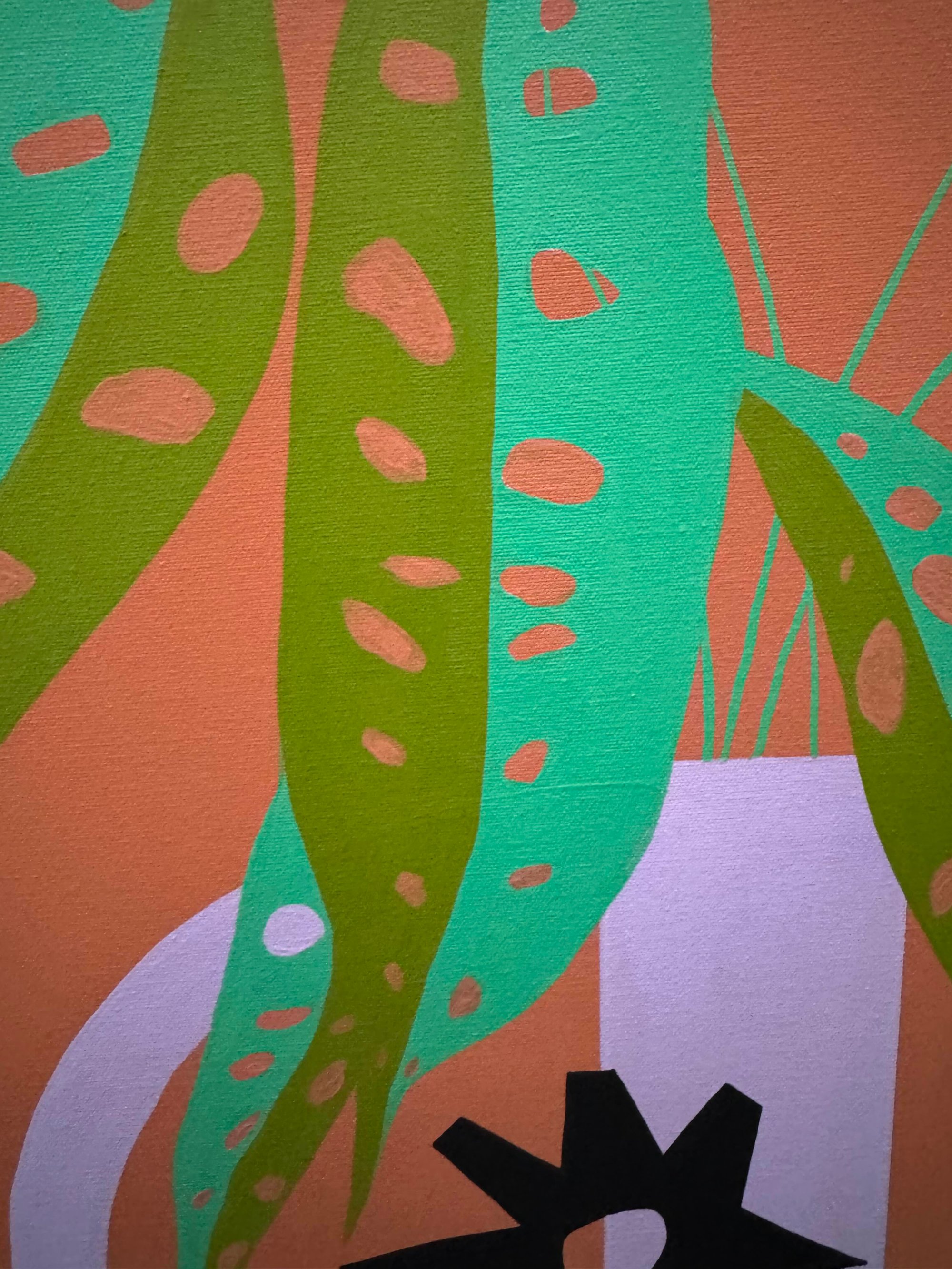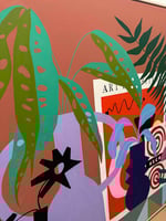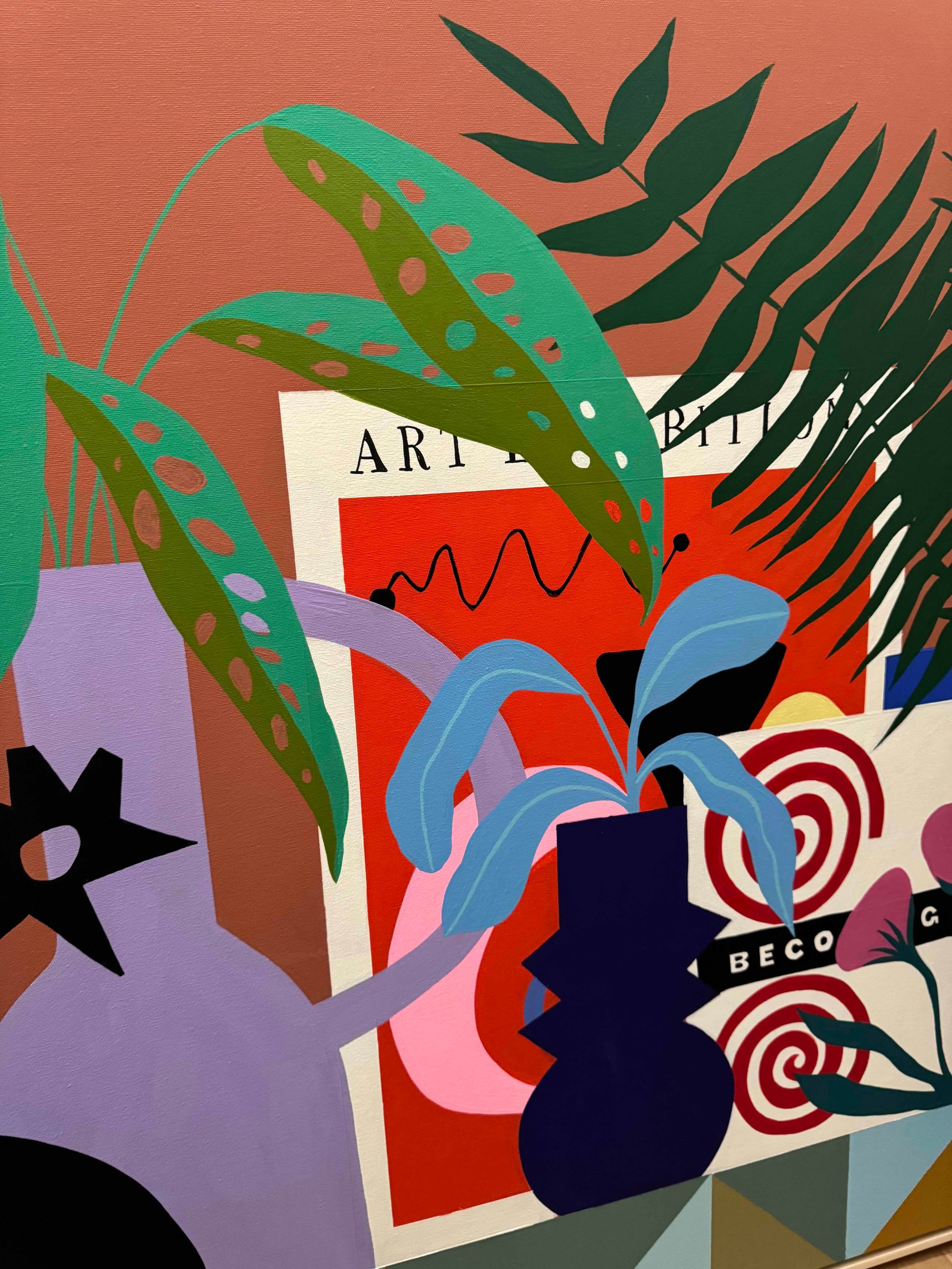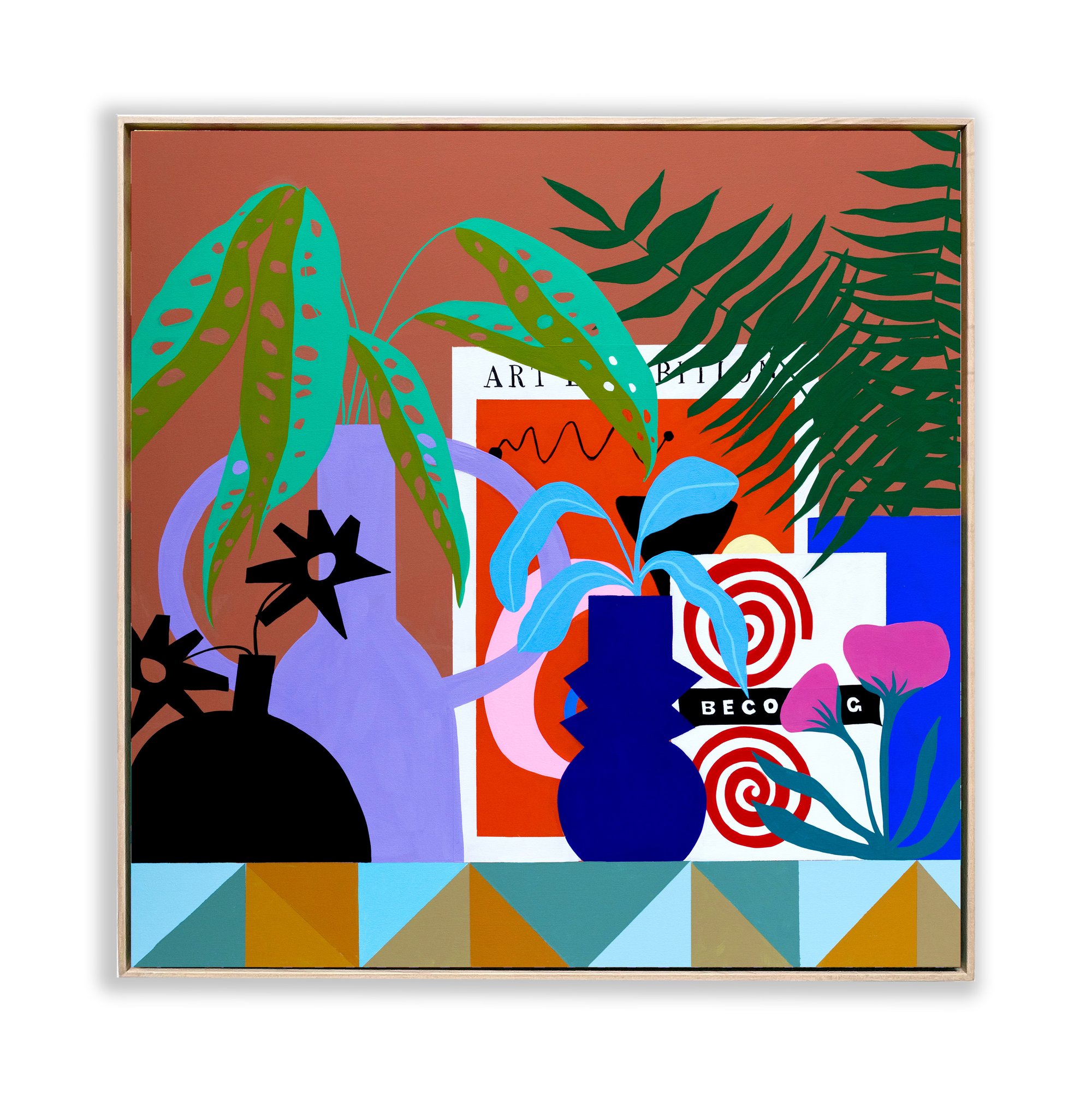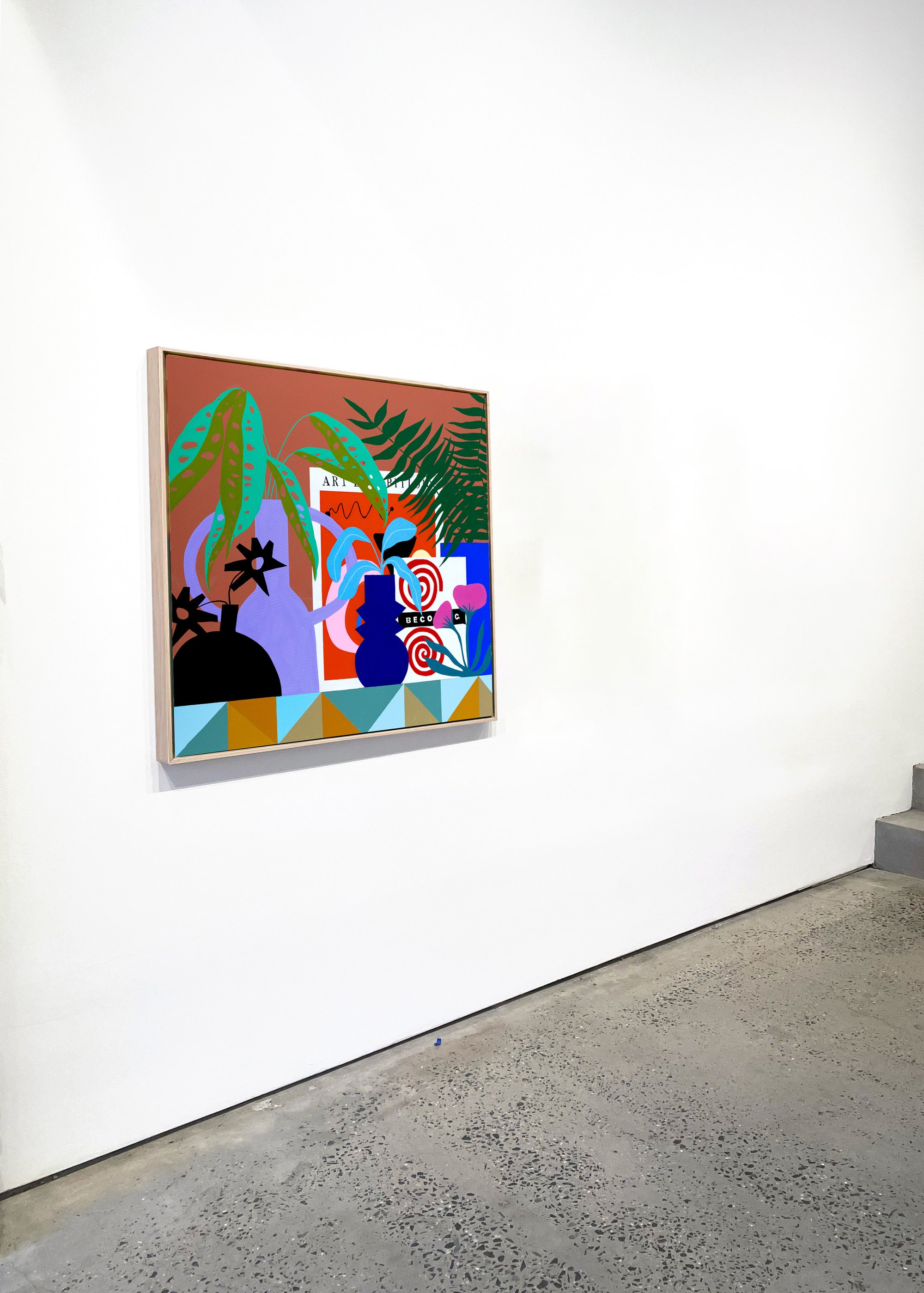 Mary Finlayson’s paintings are a celebration of color, pattern and form which navigate themes of home, memory, and self. Flattening the perspective of each scene, her works provide an intimate glimpse into each curated space. Her interiors pay homage to the iconic works of David Hockney, Henri Matisse, and Stuart Davis by borrowing similar bright color palettes, repetitive patterns and forms simplified, yet still creating complex, tightly constructed compositions unique to her own style.