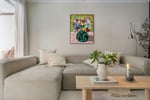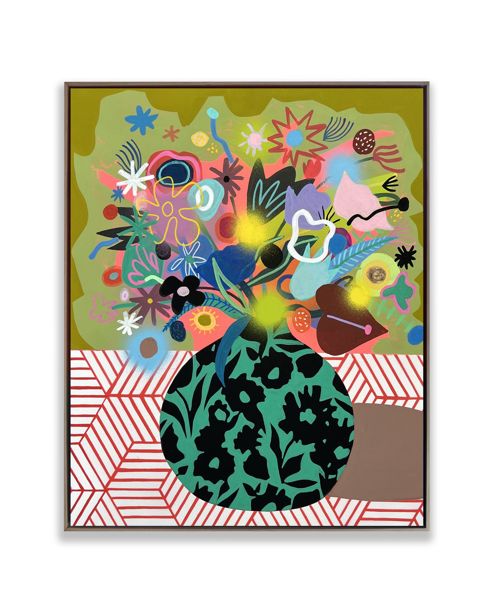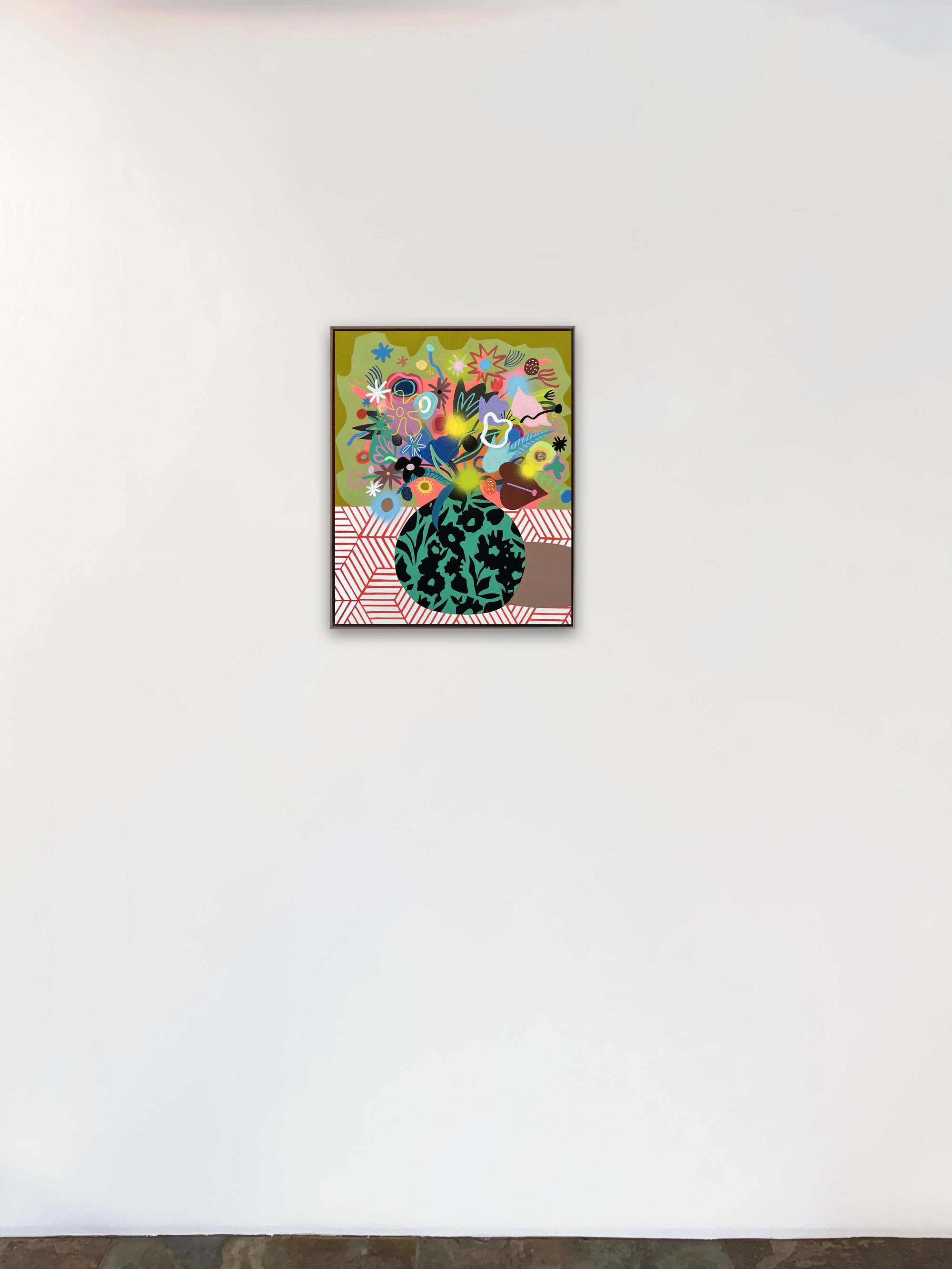 Mary Finlayson’s paintings are a celebration of color, pattern and form which navigate themes of home, memory, and self. Flattening the perspective of each scene, her works provide an intimate glimpse into each curated space. Her interiors pay homage to the iconic works of David Hockney, Henri Matisse, and Stuart Davis by borrowing similar bright color palettes, repetitive patterns and forms simplified, yet still creating complex, tightly constructed compositions unique to her own style.