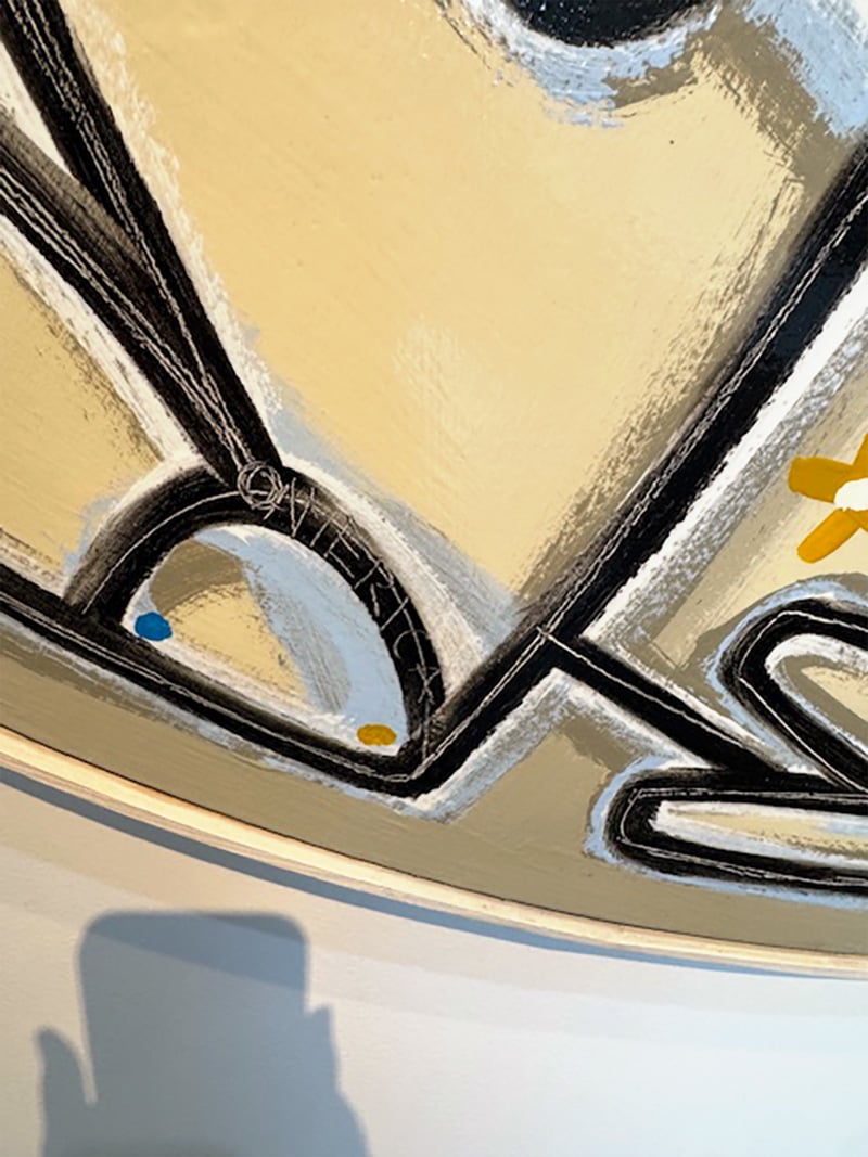 Experimenting with line weight and function as a tool for two dimensional representation of three dimensional forms, Martin takes on a new balance between solidity, weight and suggestion. Laden with nuance, the thick lines are filled with the bubbling energy of thin, long scrapes throughout their length - adding both intensity and dimension.